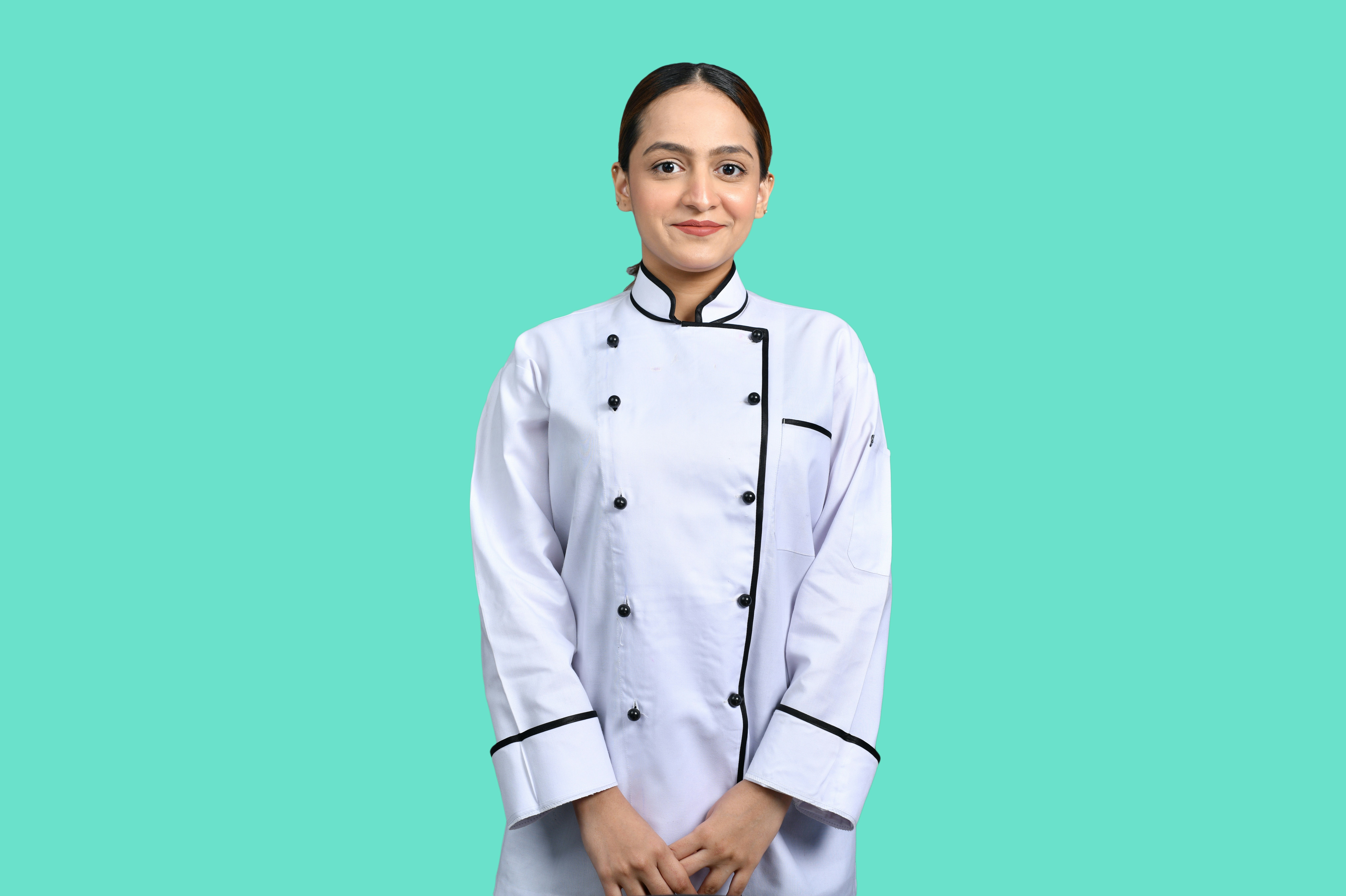 Young woman with blonde hair in white chef coat smiling in bakery